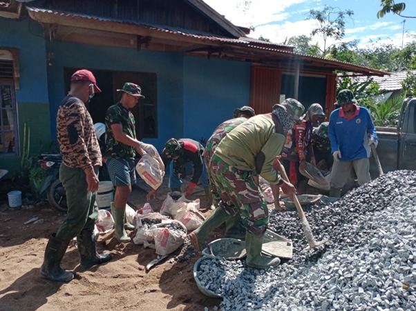 “Dalam pelaksanaan pengecoran jalan rabat beton ini sebagian para anggota satgas TMMD masih melaksanakan aktifitasnya dalam melangsir koral dan pasir untuk didekatkan ke mesin molen yang nantinya akan dijadikan adukan cor” ungkap Sertu Ronisal.