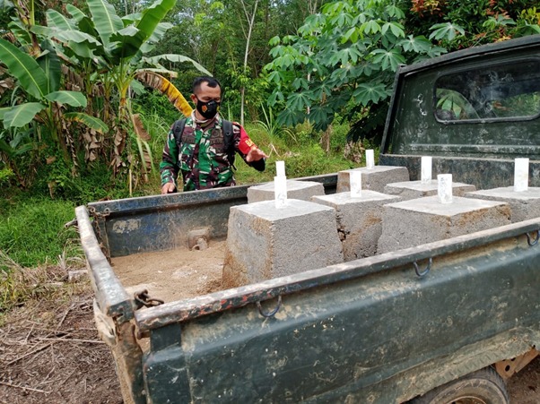 Kubu Raya – Sebanyak 7 landasan tiang bendera dari rencana 150 landasan tiang bendera telah datang di lokasi TMMD ke-111 Kodim 1207/Pontianak di Dusun Maju Jaya, Desa Kuala Mandor B, Kecamatan Kuala Mandor B, Kabupaten Kubu Raya, Sabtu (03/07/2021).