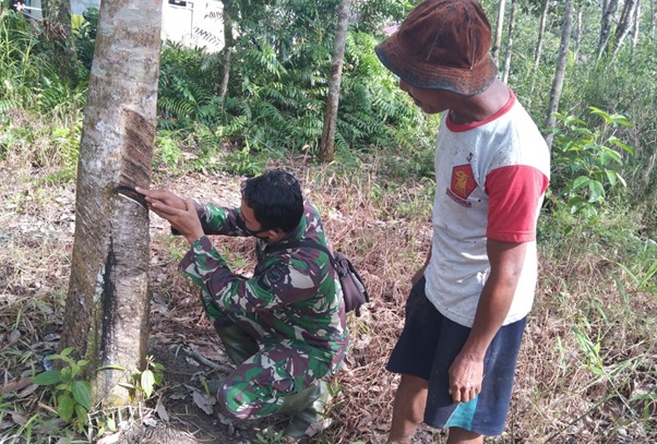 Kubu Raya – Sudah seminggu kegiatan TMMD ke-111 Kodim 1207/Pontianak berlangsung dengan lancar. Padatnya jadwal kegiatan TMMD ke-111 baik kegiatan fisik maupun yang non fisik, terlihat anggota satgas manfaatkan waktu istrahatnya untuk menyempatkan diri komsos dan membantu warga di DDesa Kuala Mandor B, Kecamatan Kuala Mandor B, Kabupaten Kubu Raya menyadap karet, Senin (21/06/2021).
