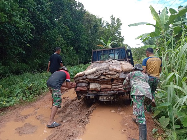 Mobil yang bermuatan karet yang akan dibawa ke pabrik terperosok karena jalannya becek dan berlobang, sehingga mobil pickup terperosok di jalan. Sopirnya mengatakan bahwa mobil yang dibawanya tiba-tiba ban belakang terperosok di jalan tanah yang becek dan berlumpur akibat tadi malam diguyur hujan. Melihat kondisi tidak memungkinkan, anggota satgas TMMD berserta masyarakat membantu mendorong mobilnya. Dengan bantuan anggota satgas TMMD dan masyarakat, mobil pickup yang berisi muatan karet berhasil ditarik dan didorong.