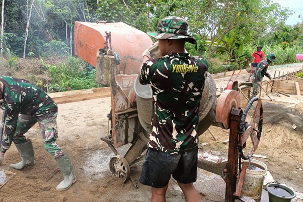 Pekerjaan rabat beton jalan terus berjalan, personil satgas bersama warga Dusun Maju Jaya terus memacu sebelum TMMD ke-111 /Kodim 1207/Pontianak sampai nanti resmi ditutup. Serda M Yamin personil Koramil 1207-11/Batu Ampar yang tergabung dalam satgas TMMD mengawaki mesin molen dengan sigap sambil menginjak kendali, kemudi diputarkan kearah pengusung, diawali dari air, semen berlanjut pasir dan koral.
