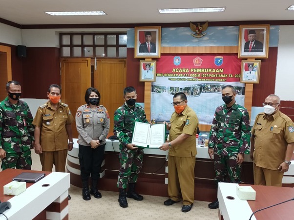 Kubu Raya – Rangkaian acara penandatanganan dan penyerahan naskah serah terima program TMMD ke-111 TA. 2021 oleh Bupati Kubu Raya yang diwakili Asisten 1 Pemkab Kubu Raya bapak Mustafa, S.H., M.H., kepada Komandan Kodim 1207/Pontianak Kolonel Inf. Jajang Kurniawan, S.IP., M.M., yang dilaksanakan di ruang rapat kantor Bupati Kubu Raya. Selasa (15/06/2021)