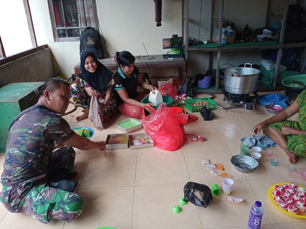 Sementara itu, Serda Brain juga dengan ikhlas membantu Suci menyiapkan makanan karena bagi mereka ini merupakan bentuk rasa kebersamaan antara TNI dengan warga.