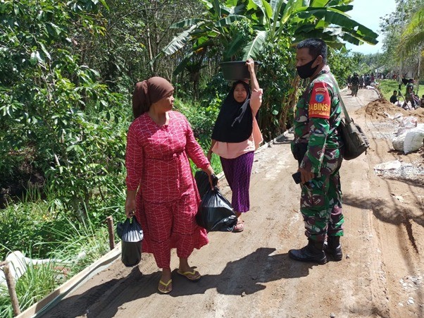 Kubu Raya – Program TMMD ke-111 Kodim 1207/Pontianak yang dilaksanakan di Dusun Maju Jaya, Desa Kuala Mandor B, Kecamatan Kuala Mandor B, Kabupaten Kubu Raya telah memasuki minggu ke 5 sejak dibuka pada tanggal 15 Juni 2021. Progres pembangunan yang dicapai juga terlihat signifikan, hal ini tidak terlepas dari peran serta dari berbagai komponen masyarakat, yang salah satunya adalah peran aktif ibu-ibu Dusun Maju Jaya peran ibu-ibu dalam mensukseskan TMMD. Merekalah yang membantu menyiapkan logistik dengan memasak di dapur, seperti yang terlihat ibu-ibu sedang membawa logistik untuk makan siang personil satgas TMMD ke-111 dan masyarakat yang ikut serta dalam pelaksanaan TMMD, Rabu (30/06/2021).