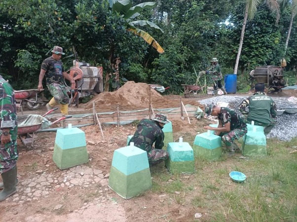 Persiapan Menyambut HUT Kemerdekaan RI Ke-76, Satgas TMMD Ke-111 Kodim 1207/Pontianak Mulai Mengecat Tatakan Tiang Bendera