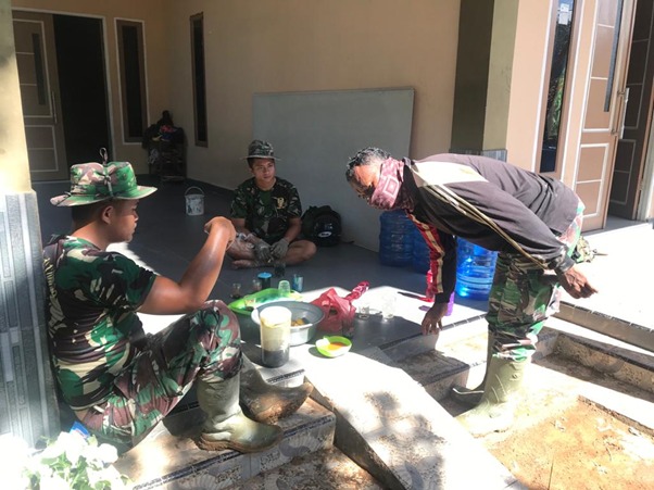 Bersantai sejenak makan pisang goreng dan minum kopi panas yang disiapkan oleh ibu-ibu warga Dusun Maju Jaya sambil menikmati angin sepoi-sepoi adalah rutinitas yang dilakukan anggota satgas TMMD bersama warga setempat yang ikut membantu bekerja mengecor jalan. Secara tidak langsung hal ini dapat menumbuhkan momen kebersamaan dan keakraban yang erat antara TNI dan warganya. Warga tidak sungkan-sungkan bercengkrama dengan anggota satgas sambil bersantai menikmati hidangan yang telah tersedia.