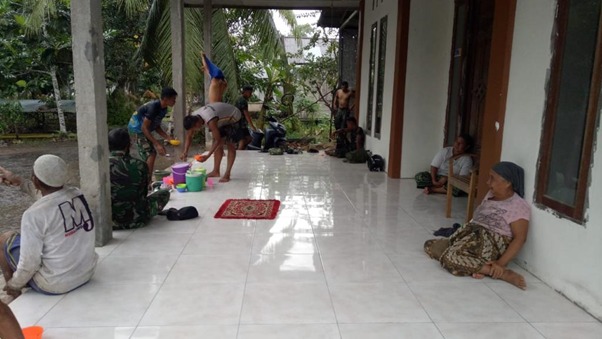 Dukungan dari ibu Lasmi dalam bentuk makanan dan minuman ini dapat menambah semangat bapak-bapak TNI dalam bekerja. Sambil bersenda gurau dan bercerita dengan warga lainnya, anggota satgas yang tengah berisitirahat menikmati kue dan kopi yang telah disuguhkan.