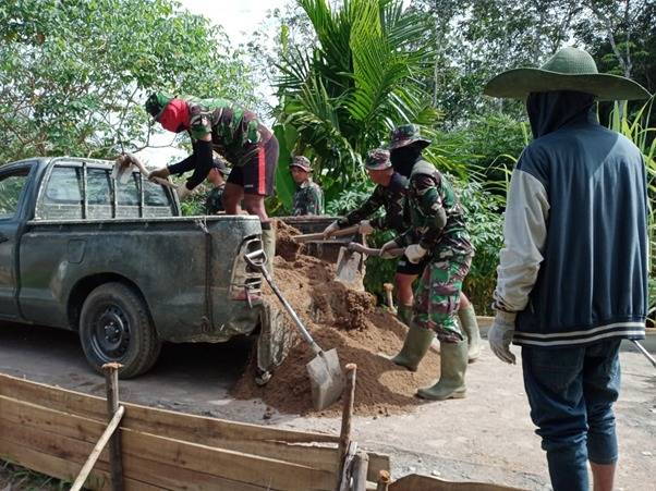 Kubu Raya – Satgas TMMD ke-111 Kodim 1207/Pontianak bersama warga mengangkut bahan material pembangunan jalan rabat beton di Desa Kuala Mandor B, Kecamatan Kuala Mandor B, Kabupaten Kubu Raya, Sabtu (26/06/2021).
