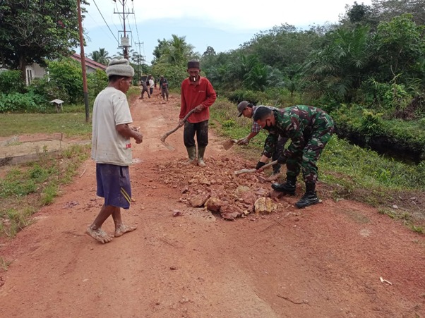 “Kami bersama masyarakat sejak beberapa waktu lalu sudah melakukan penimbunan dan mencangkuli tanah yang tinggi, kemudian kami ratakan di jalan sebagai akses masuk ke lokasi TMMD” ucapnya.