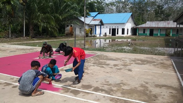 Lapangan voli yang biasa digunakan untuk berolahraga oleh warga setempat sudah sepatutnya dibenahi. Agar terlihat lebih rapi, bersih dan menarik. Anggota satgas TMMD bersama warga mengecat lantai lapangan voli yang terbuat dari semen, tujuannya agar warga setempat bisa menghidupkan kembali lapangan voli ini dan lebih giat lagi berolahraga.