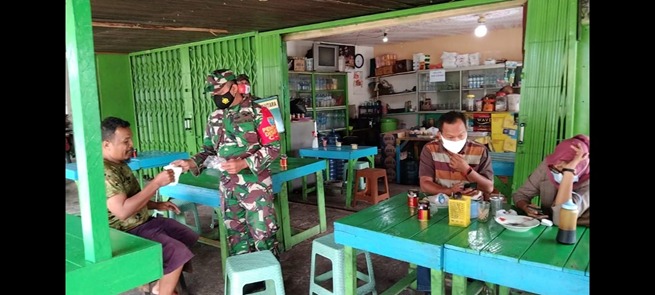 Kubu Raya – Satgas TMMD Reguler Ke-111 Kodim 1207/Pontianak tengah membagikan masker dan melakukan himbauan kepada warga yang melintasi maupun yang sedang beristirahat di warung warung Kopi, Sabtu (19/06/2021).
