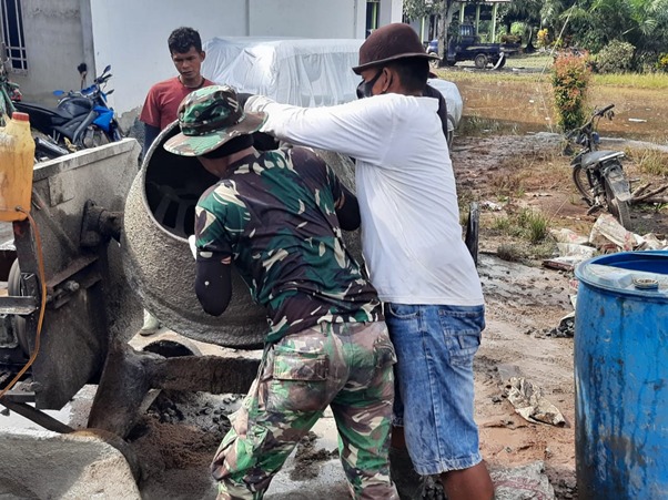 Sertu Yudi Suryanto anggota satgas yang selama ini pegang roskam/raskam kayu yang berfungsi meratakan dan menghaluskan plesteran, kali ini yang dia pegang mesin molen.