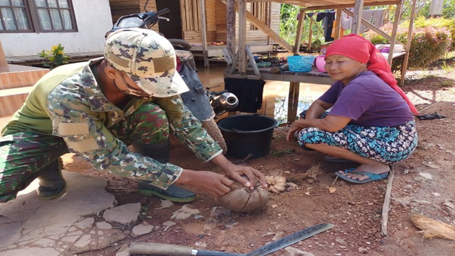 Senyum Bangga Ibu Supi’ah Saat Sertu Komang Membantu Kupas Kelapa