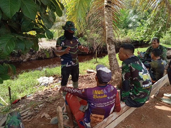 Kubu Raya – Disaat waktu istirahat, Sertu Penu memberi arahan kepada anggota yang BP dari satuan Yon Kav 12/BC di lokasi TMMD ke-111 Kodim 1207/Pontianak yang berada di Dusun Maju Jaya, Desa Kuala Mandor B, Kecamatan Kuala Mandor B, Kabupaten Kubu Raya, Senin (05/07/2021).