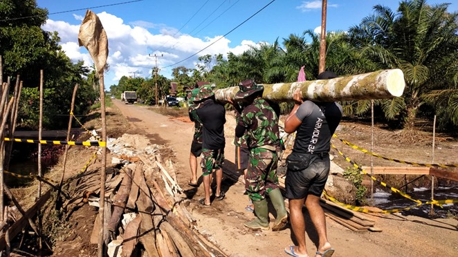 “Jalur ini sangat vital karena hasil perkebunan warga kecamatan kuala mandor B di bawa menggunakan jalur ini, selain itu distribusi sembako jangan sampai terganggu dengan putusnya jembatan ini” tutupnya sambil bergegas mengatur anggota yang memikul balok agar di susun di atas jembatan yang jebol.