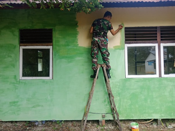 Pontianak – Anggota satgas TMMD ke-111 Kodim 1207/Pontianak mengecat posko TMMD yang bertempat di Dusun Maju Jaya, Desa Kuala Mandor B, Kecamatan Kuala Mandor B, Kabupaten Kubu Raya, Kamis (24/06/2021).