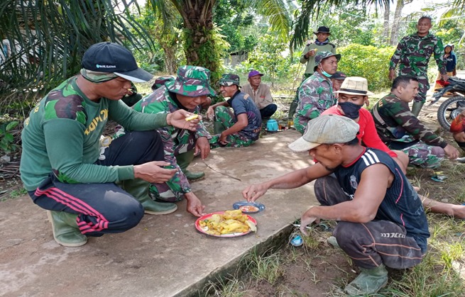 Kubu Raya – Selama pelaksanaan TMMD Reguler ke-111 Kodim 1207/Pontianak di lokasi pengecoran jalan di Desa Kuala mandor B Kecamatan Kuala mandor, cemilan berupa singkong goreng dan sambal selalu menemani Satgas TMMD dan warga. Makan kecil ini disuguhkan bersama minuman Kopi atau Teh oleh warga setempat, Sabtu (19/06/2021).