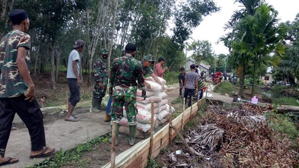 Tak kenal lelah, dengan semangat yang tinggi siang dan malam TNI dan warga bekerja sama saling bahu-membahu dan tolong menolong mengangkut material dan kebutuhan lainnya agar kegiatan pengecoran jalan rabat beton di Desa Kuala Mandor B, Kabupaten Kubu Raya ini bisa berjalan dengan baik.