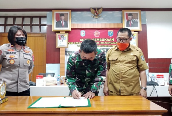 Kubu Raya – Meskipun pandemi covid-19 belum menunjukkan penurunan di Indonesia pada khususnya di Kab. Kubu Raya, namun tak menghalangi niat tulus anggota TNI AD Kodim 1207/Pontianak untuk bertugas dalam melaksanakan kegiatan TMMD ke-111 TA. 2021. Pembukaan TMMD ke-111 TA. 2021 Kodim 1207/Pontianak dibuka secara resmi oleh Bupati Kubu Raya yang diwakilkan Asisten 1 bapak Mustafa, SH., MH., yang bertempat di ruang rapat kantor Bupati Kubu Raya, Rabu (16/06/2021).