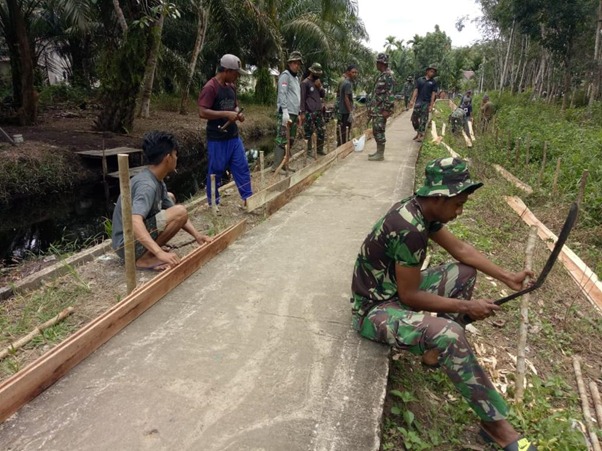 Pontianak – Sebelum melaksanakan pengecoran jalan rabat beton di Dusun Maju Jaya, Desa Kuala Mandor B, Kecamatan Kuala Mandor B, Kabupaten Kubu Raya, anggota satgas TMMD ke-111 dibantu warga setempat mengerjakan pemasangan papan mal, Rabu (16/06/2021).