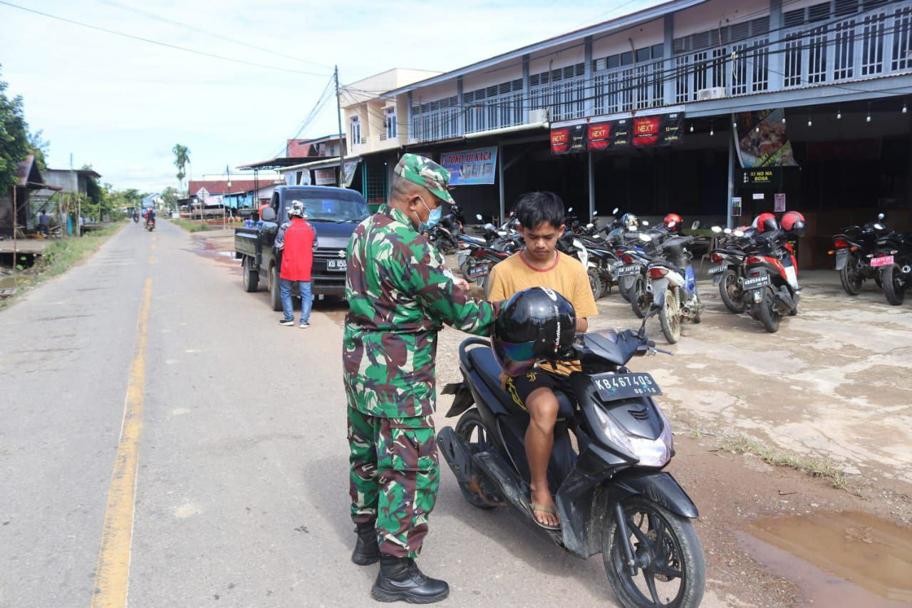 Pala Pulau – Babinsa koramil 1206-06/Putussibau Utara kodim 1206/Psb Serda Dakun bersama Bhabinkamtipmas Bripka Irwan Yarangga membagikan masker gratis kepada warga binaan sekaligus memberikan Sosialisasi pemahaman tentang masalah virus covid-19 (corona) kepada warga binaannya bertempat di kampung Pala Pulau, Kecamatan Putussibau selatan, Kabupaten Kapuas Hulu. Senin (14/06/21).