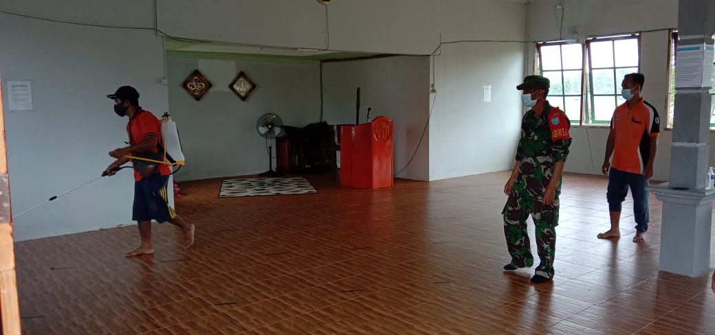 Puring Kencana – Demi mencegah penyebaran Covid-19, petugas gabungan Babinsa Koramil 1206-18/Puring Kencana melakukan penyemprotan cairan desinfektan, diseputaran tempat ibadah dan pemukiman warga di Kecamatan Puring Kencana, Kabupaten Kapuas Hulu, Sabtu (29/05/21).
