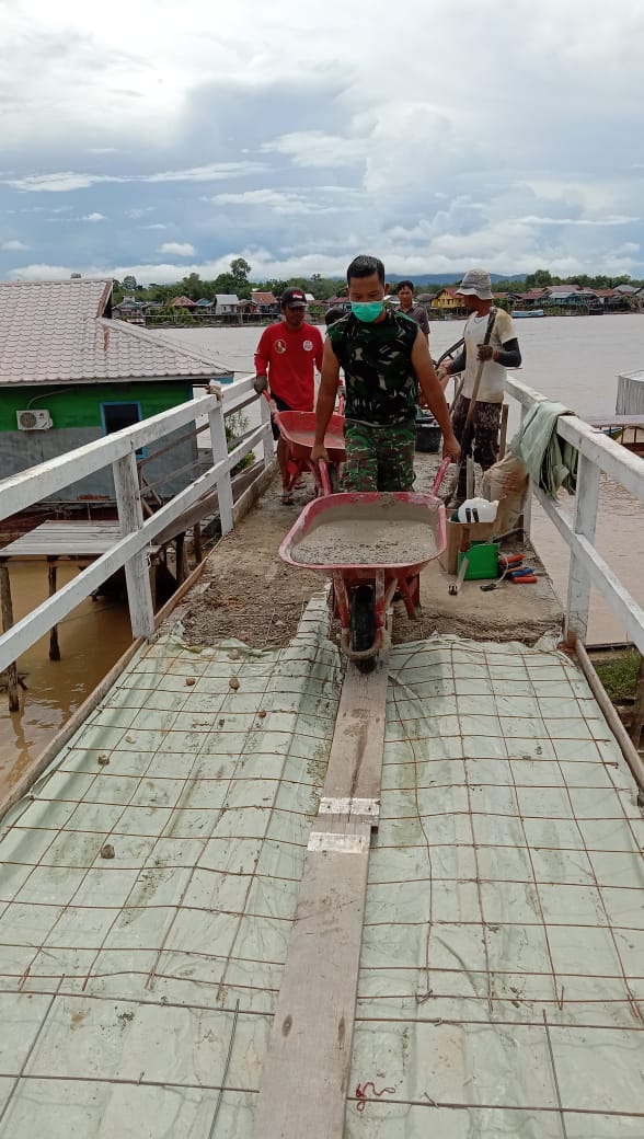 Jongkong – Terlihat Kekompakan Warga Bersama Babinsa 1206-09/Jongkong dalam pengecoran jalan menuju Dermaga di Dusun Citra Melati Desa Jongkong Pasar kecamatan Jongkong Kabupaten Kapuas Hulu. Selasa, (15/06/2021)