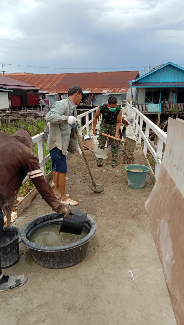 Jongkong – Terlihat Kekompakan Warga Bersama Babinsa 1206-09/Jongkong dalam pengecoran jalan menuju Dermaga di Dusun Citra Melati Desa Jongkong Pasar kecamatan Jongkong Kabupaten Kapuas Hulu. Rabu, (16/06/2021)
