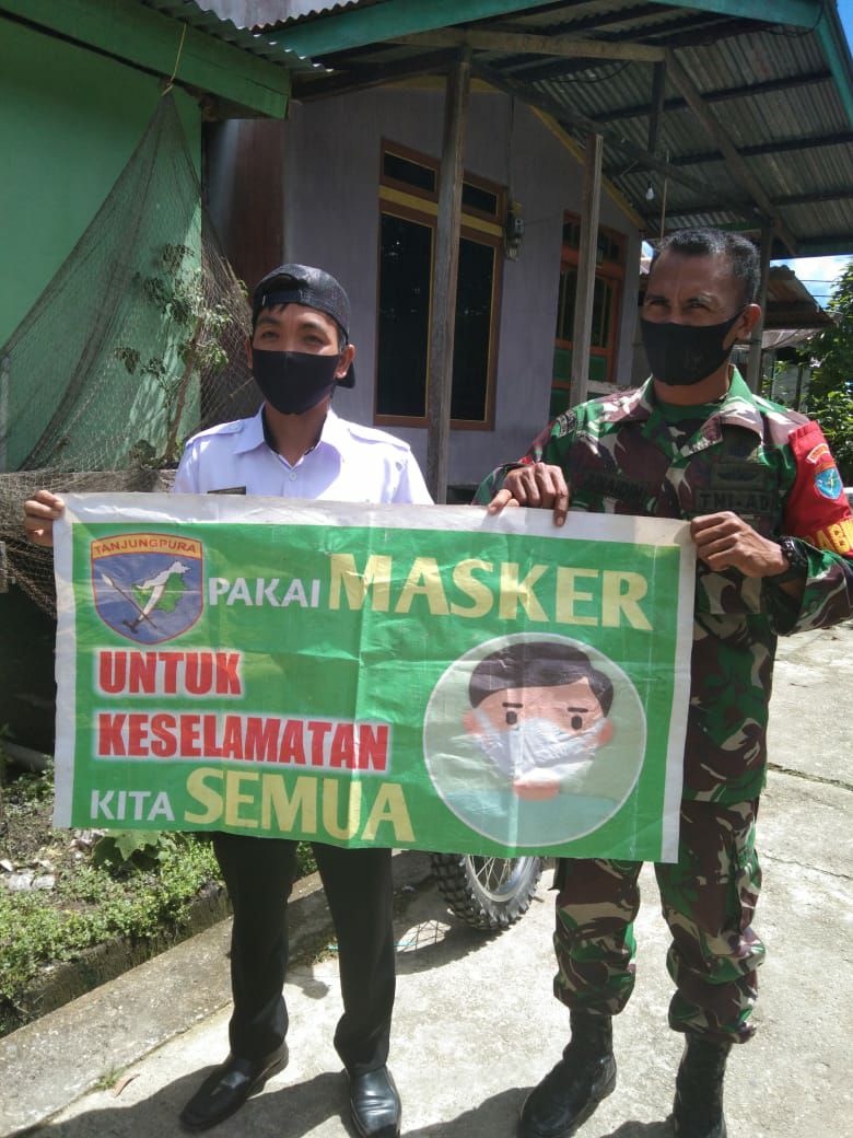Jongkong – Terlihat aksi Babinsa 1206-09/Jongkong Sertu Sumadi membagikan masker kepada Warga Upaya dalam memutuskan mata rantai penyebaran COVID-19 dan memberikan himbauan ,Teguran tentang penerapan protokol kesehatan di Desa Martadana Kecamatan Pengkadan Kabupaten Kapuas Hulu Kalimantan Barat. Rabu, (16/06/2021).