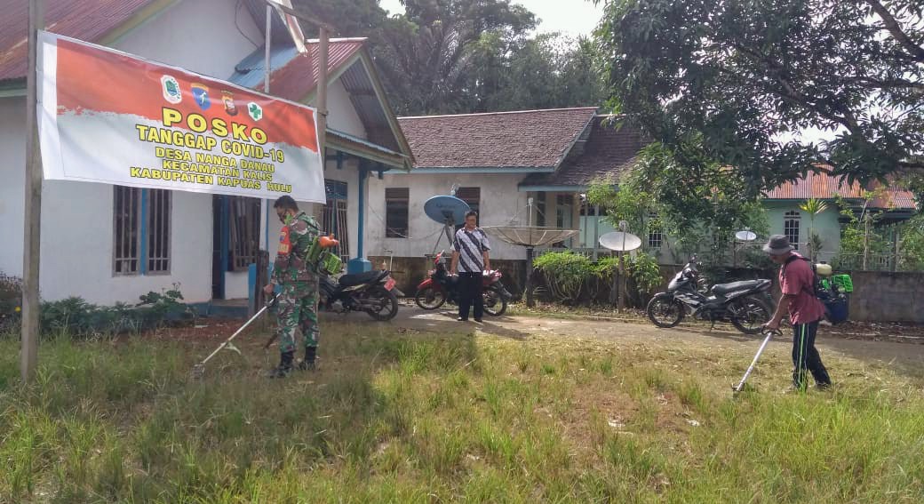 Kalis – Babinsa Koramil 1206-12/Kalis, Kodim 1206/Putussibau, Koptu Samsudin, turut serta membersihkan lingkungan di sekitair Posko COVID-19 Desa Nanga Danau, Kecamatan Kalis, Kabupaten Kapuas Hulu, Provinsi Kalimantan Barat. Jum’at, (18/06/2021).