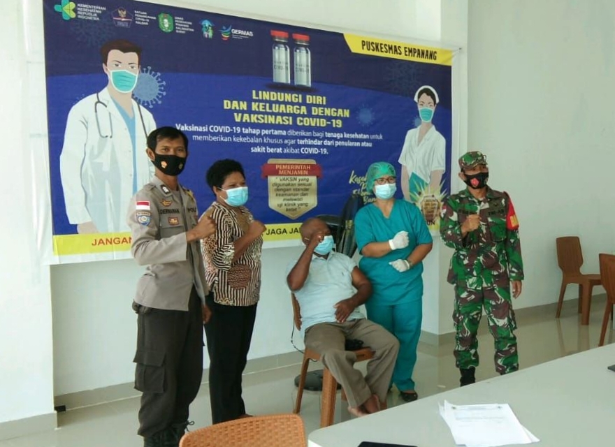 Empanang – Babinsa 07/Empanang Serda Rusdi bersama Bhabinkamtibmas Empanang Melaksanakan monitoring dan pengamanan pelaksanaan Vaksinasi Covid-19 tahap I yang dilaksanakan oleh Dinkes Kapuas Hulu melalui Pihak Puskesmas Empanang dengan sasaran Lansia Di Wilayah Desa Nanga Kantuk bertempat di Puskesmas Empanang, Kecamatan Empanang, Kabupaten Kapuas Hulu. Selasa (01/06/2021)