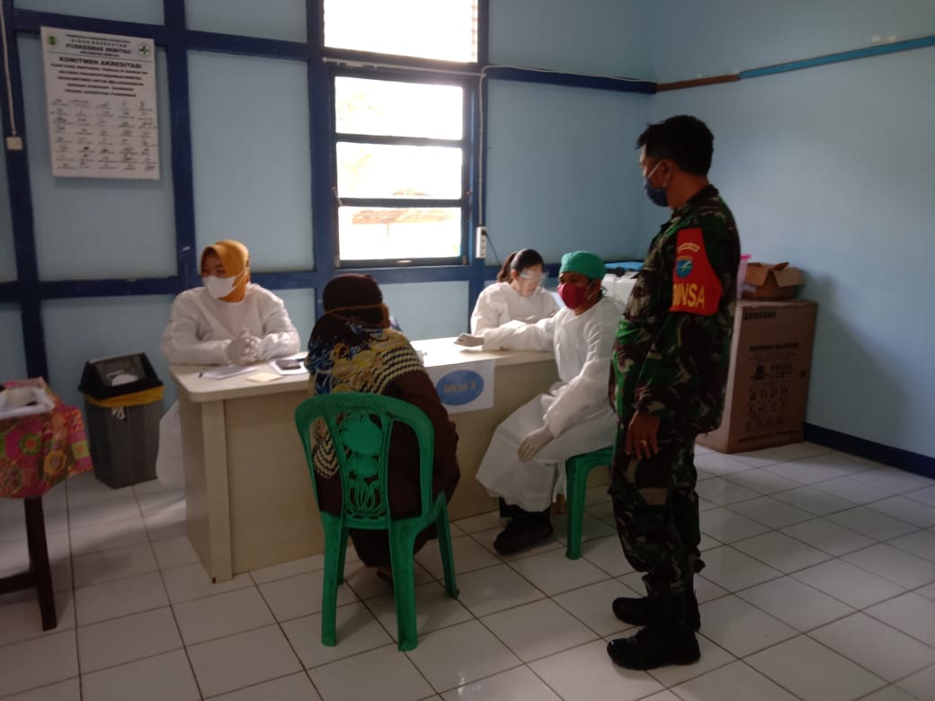 Semitau – Anggota Koramil 1206-02/Semitau Serda Sahat Hamonangan Sirait dampingi Petugas Puskesmas Semitau melakukan Swab test terhadap warga Binaanya, yang di laksanakan di Puskesmas Semitau, Senin (14/06/2021).