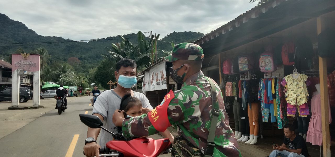 Batang – Upaya pencegah penyebaran Covid-19 terus dilakukan Babinsa Koramil 1206-03/Batang Lupar Serda Dedi. Salah satunya dengan membagikan masker secara gratis di Pasar Sepandan, Kecamatan Batang Lupar, Kapuas Hulu. Sabtu (12/06/21)