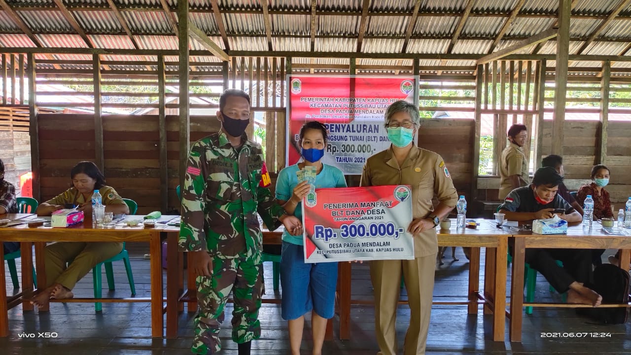 Putussibau Utara – Babinsa Ariung Mendalam Praka Dedik Sulistiyo Anggota TNI dari Koramil 06/Putussibau Utara Kodim 1206/PSB membantu menyalurkan Bantuan Langsung Tunai (BLT) Dana Desa di wilayah binaanya Desa Ariung Mendalam, Kecamatan Putussibau Utara, Selasa (08/06/2021).