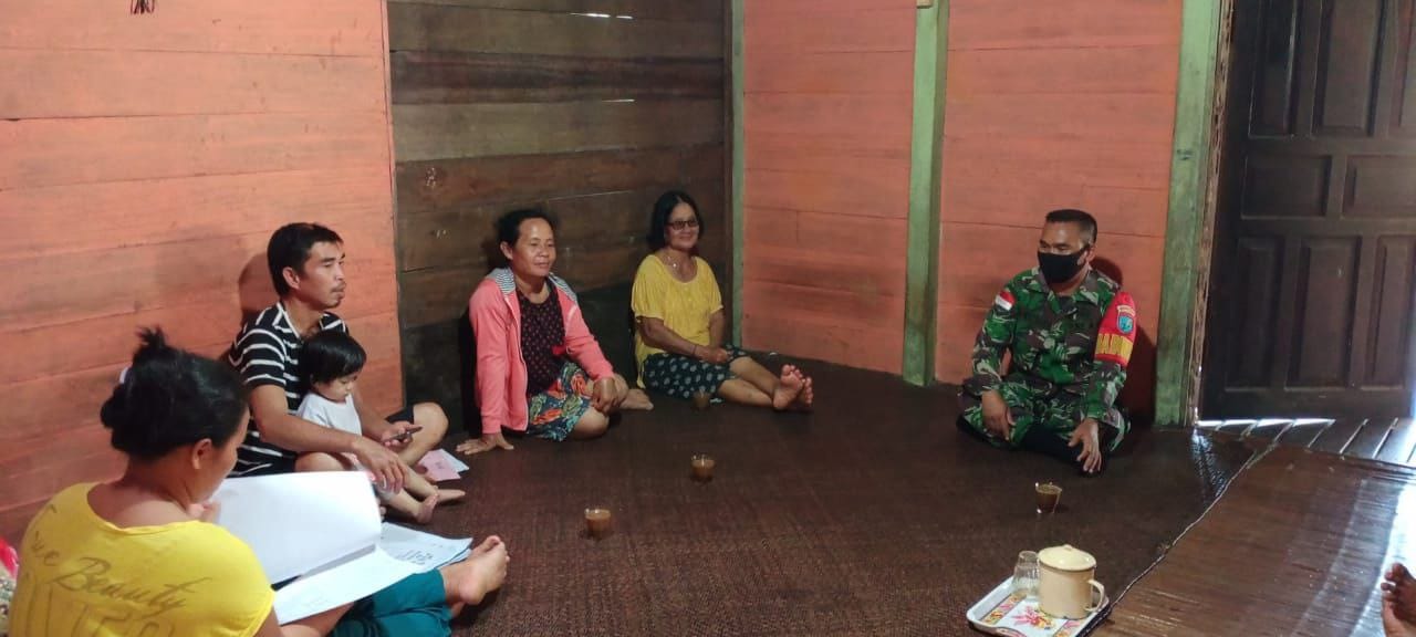 Puring Kencana – Dengan melaksanakan Melalui Komunikasi Sosial (Komsos) Anggota Babinsa Koramil 1206-18 / Puring Kencana Pelda Rustam memberikan himbauan kepada warga binaan Agar tetap mematuhi protokol kesehatan, di Desa Sungai Antu. Rabu, (02/06/2021).