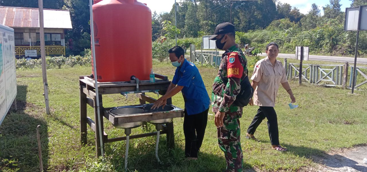 Sawah- Babinsa Koramil 1206-03/Batang Lupar Kelurahan Sawah, Turut mendukung kebijakan pemerintah terkait New Normal, dengan ikut mengawasi serta membantu penerapan protokol kesehatan ketat di areal Rumah Betang Sawah di Kecamatan Batang Lupar, Kabupaten Kapuas Hulu untuk mencegah dan menekan penyebaran pandemi Covid-19, senin (07/06/21).