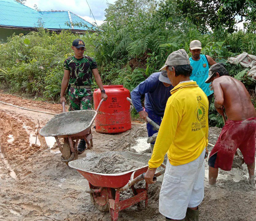 Bukit Penai – Babinsa Koramil 1206-11/Silat Hilir, Serda Sudarmono bersama masyarakat Desa Bukit Penai, Kecamatan Silat Hilir, Kabupaten Kapuas Hulu bergotong royong memperbaiki jalan sepanjang 100 meter dan lebar 2 meter di desa tersebut, Minggu (13/06/201).