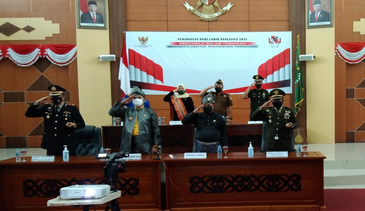 Kapuas Hulu – Memperingati Hari Lahir Pancasila, Dandim 1206/Putussibau Letkol Inf Jemi Oktis Oil S.I.P Ikuti Upacara secara virtual melalui Media Online Bersama Presiden RI. Kegiatan tersebut di gelar bersama Bupati Kapuas Hulu, yang di Wakili Wabup, Beserta Forkopimda Kapuas Hulu di Aula Kantor DPRD Kapuas Hulu, Selasa ( 01/06/2021 )