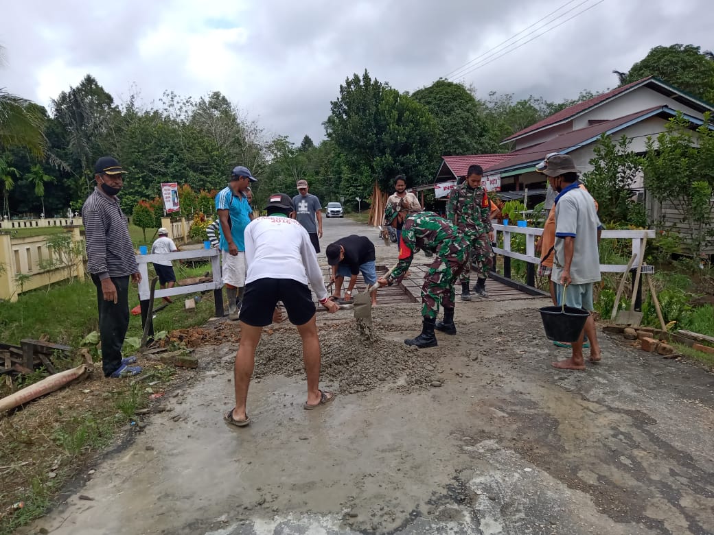 Personil Koramil Embaloh Hulu bahu membahu bekerja mengecor jalan berlubang, terlihat semangat gotong royong dan kedekatan TNI dengan rakyat.