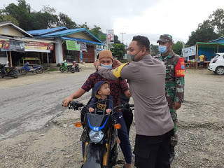 Pengkadan-Gayung bersambut Babinsa 1206-09/Jongkong Sertu Sumadi, Bhabinkamtibmas Pengkadan Bripda Ade Yoga dalam melaksanakan penertipan Prototokol kesehatan di Simpang Rulkan Desa Sira jaya Kecamatan Pengkadan Kabupaten Kapuas Hulu. Sabtu, (12/06/2021)