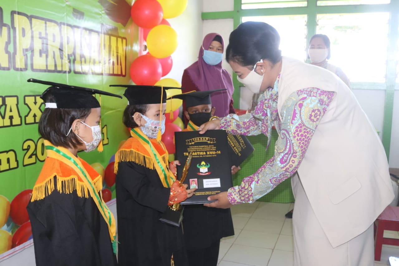 Dalam kesempatan itu Ketua Yayasan Kartika XVII – 14 Dim 1206/PSB, Ny Denik Bunga Jemi Oktis Oil, menyerahkan Sertifikat Tanda Tamat Belajar (SKTTB) secara simbolis kepada murid KB dan TK Kartika XVII – 14 Dim 1206/PSB.