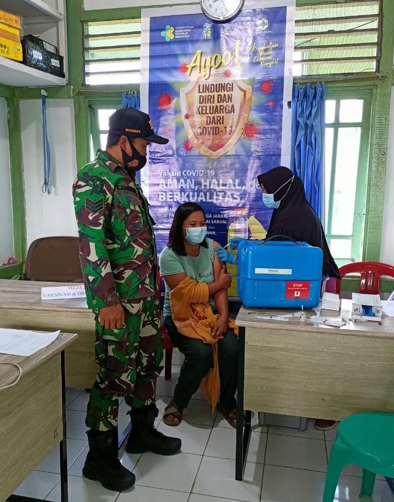 Selimbau – Dukung pelaksanaan vaksinasi covid-19, PJ Danramil 10/Selimbau Serka Eko lakukan pengawasan dan pendampingan penyuntikan vaksin covid-19 kepada Warga Masyarakat di wilayah Selimbau yang dilaksanakan di aula puskesmas Selimbau, Kabupaten Kapuas Hulu, Jumat (18/06/2021).
