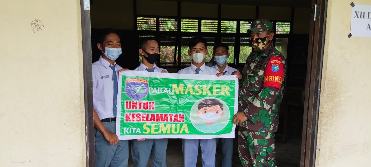 Pengkadan – Babinsa1206-09/Jongkong Mengajak Muda Mudi Pelajar SMAN 1 Wajib mengunakan Masker dalam menghadapi pandemi COVID-19 di SMAN 1 Pengkadan Desa Riam Panjang Kecamatan Pengkadan Kabupaten Kapuas Hulu Kalimantan Barat. Selasa, (15/06/2021)