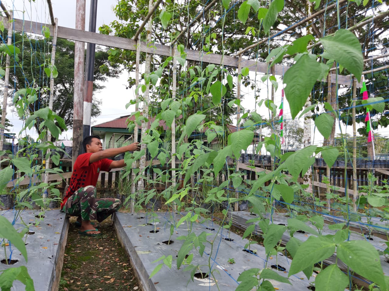 Putussibau – Di tengah wabah virus corona atau Covid-19, anggota Kodim 1206/Psb menanam sayuran di polybag atau tempat budidaya tanaman di wilayah Makodim, Kabupaten Kapuas Hulu. Selasa (01/06/21)