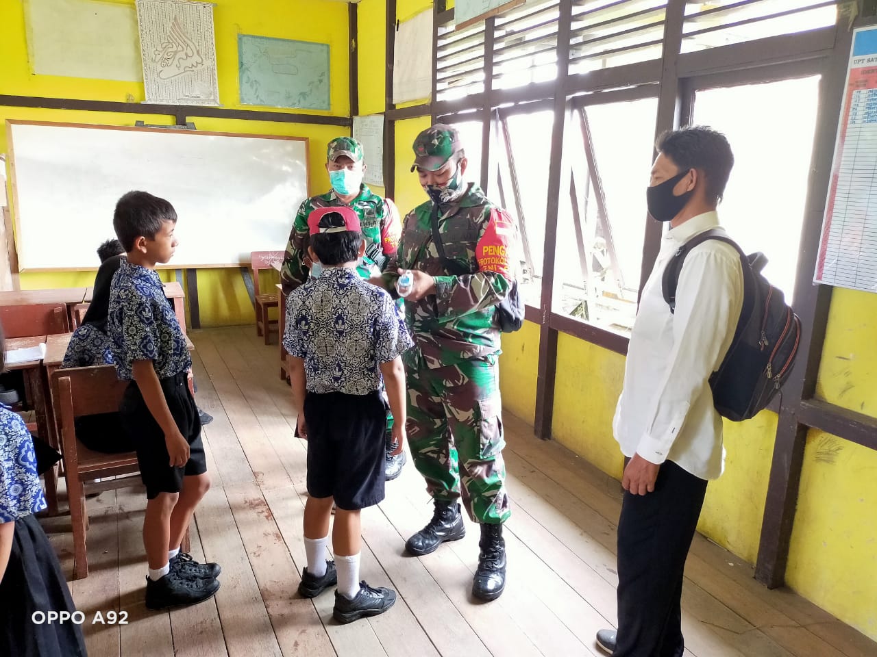 Boyan Tanjung – Dalam rangka mencegah peningkatan mewabahnya Virus Corona, Personil Babinsa Koramil 1206-08 / Bunut Hilir Koptu Lili Jeri dan Kopda Deni bersama memberikan edukasi cara mencegah penularan Covid 19, terhadap siswa siswi salah satu Sekolah Dasar Negeri (SDN) 16 UPT XV/ Boyan Tanjung yang berada di Dusun Trans Menin, Desa Mujan, Kecamatan Boyan Tanjung, Rabu (02/06/2021).