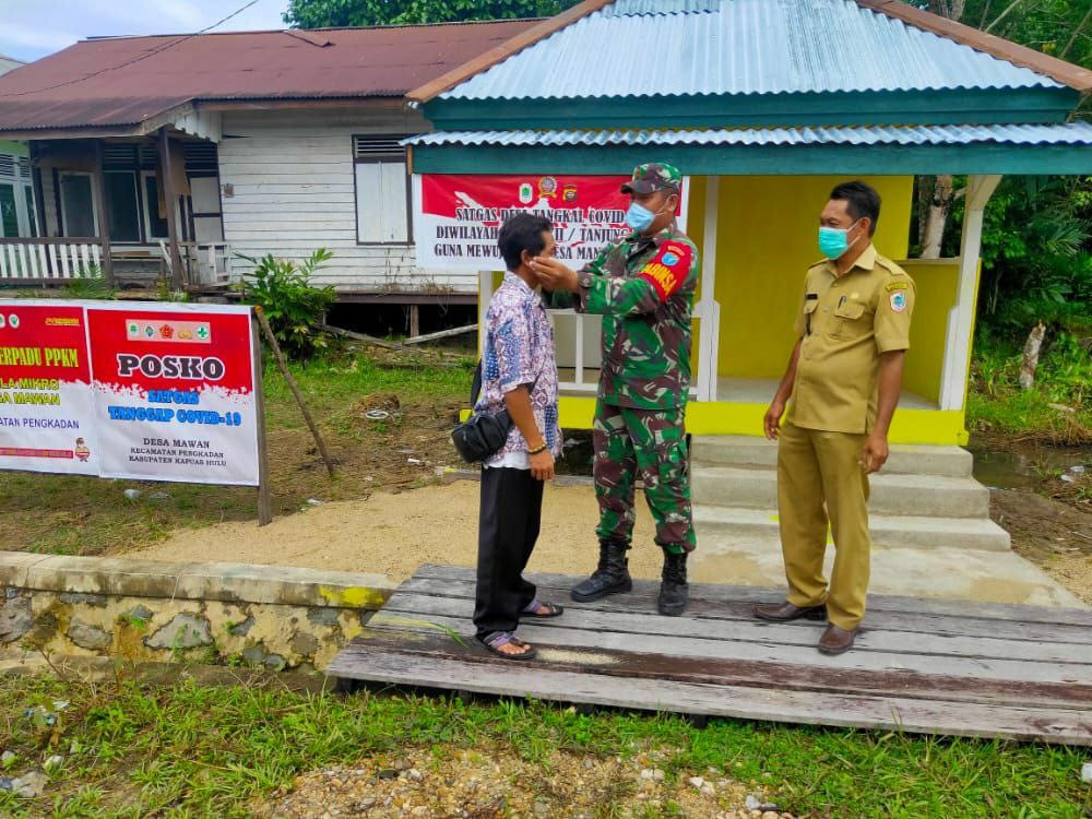 Mawan – Babinsa Desa Mawan Praka Zulfikor, Koramil 1206-09/Pengkadan dan Staf Desa Mawan melaksanakan Giat Bakti Sossial, Sosialisai Prokes dan pembagian masker kepada masyarakat pengguna jalan di seputaran jalan desa Mawan, Dalam rangka mencegah dan mengurangi resiko penyebaran virus Corona ( Covid-19 ) Khususnya di Desa Mawan, kecamatan Pengkadan, kabupaten Kapuas Hulu, Rabu (16/06/21).
