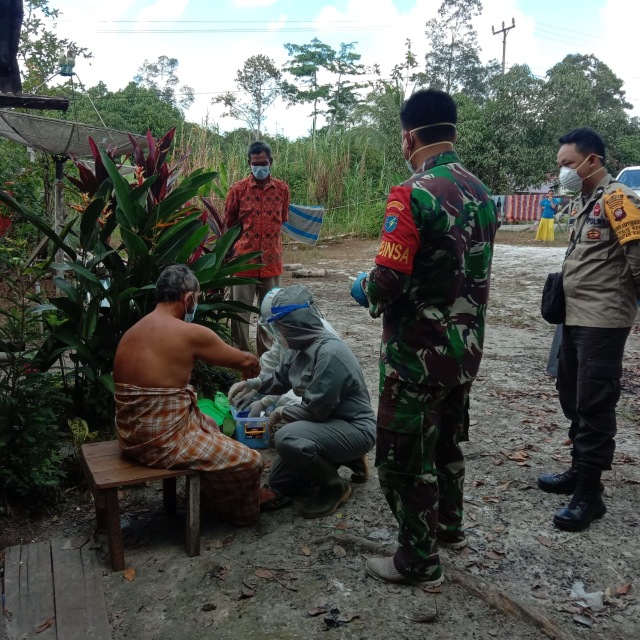 Kalis – Babinsa Koramil 1206-12/Kalis, Praka I Kadek bersama Praka Husein, mendampingi Tim Gugus Tugas COVID-19 Kecamatan Kalis, Kabupaten Kapuas Hulu, Provinsi Kalimantan Barat, ikut serta dalam pendampingan tracing dan swab terhadap pasien yang terkonfirmasi positif Covid-19. Rabu, (09/06/2021).