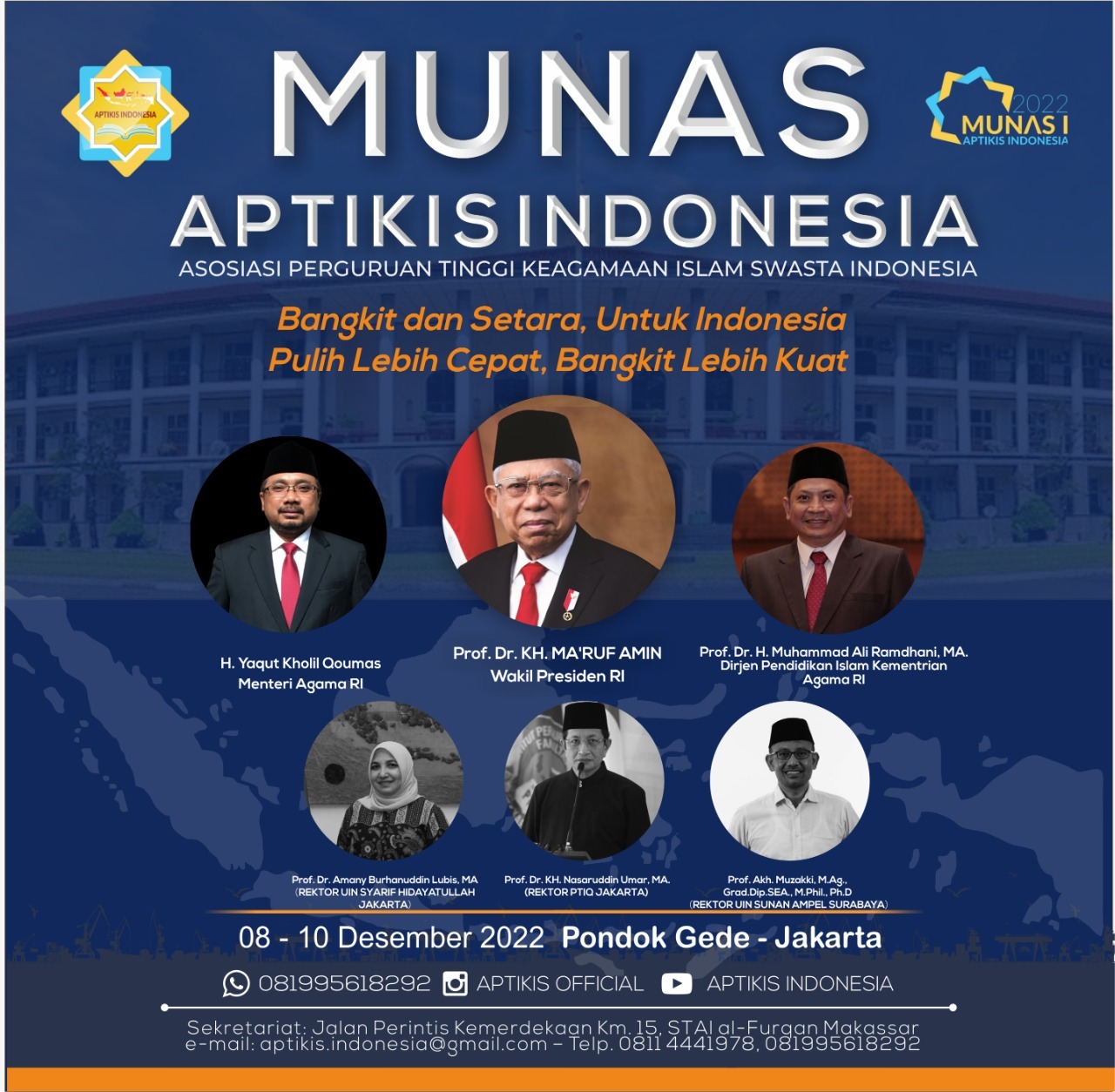 “Semangat itulah yang menjadi dasar kami untuk membentuk wadah bagi (PTIKIS), Musyawarah Nasional (Munas) pertama akan digelar pada 08 s.d 10 Desember 2022 di Asrama Haji Pondok Gede untuk pengesahan Asosiasi Perguruan Tinggi Keagamaan Islam Swasta (APTIKIS) yang dibuka langsung oleh Wakil Presiden Republik Indonesia” jelas Ketua Umum. 06/12/2022.