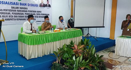 Berandang.com- Kepahiang. Dinas Pemberdayaan Masyarakat dan Desa Kabupaten Kepahiang melaksanakan sosialisasi dan diskusi dalam rangka persiapan penyusunan rancangan peraturan Bupati tentang tata cara pendirian, Pengurusan, Pengelolaan, serta pembubaran badan usaha milik dan badan usaha milik desa bersama Kabupaten Kepahiang, yang dilaksanakan diruang rapat hotel Umroh Kepahiang, Selasa pagi (10/11/2020).