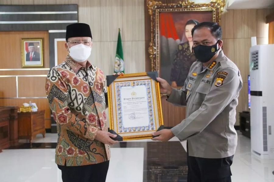 Berandang.com- Gubernur Bengkulu Rohidin Mersyah mendapatkan Pin Emas dan Piagam Penghargaan dari Kapolri Jenderal Listyo Sigit Prabowo sebagai provinsi terbaik yang miliki strategi dan peran paling efektif dalam penerapan PPKM Mikro, dan pengendalian penyebaran COVID-19. Pin Emas dan Piagam Penghargaan ini disampaikan Dir Binmas Polda Bengkulu Kombes Pol Endro Prasetyo kepada Gubernur Bengkulu Rohidin Mersyah, di Ruang Kerja Gubernur Bengkulu, Kamis (02/09).
